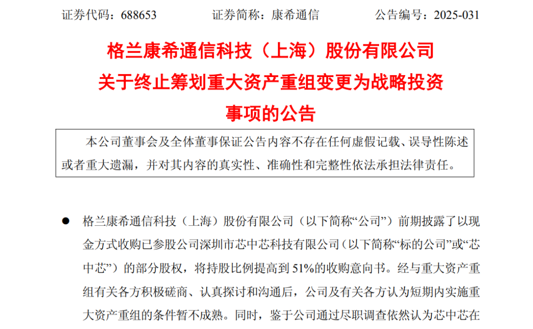 5月6日晚间,康希通信发布公告称,前期拟收购深圳市芯中芯科技有限公司(以下简称芯中芯)部分股权至持股51%的重组计划终止,因短期内实施重大资产重组的条件暂不成熟,现以1.35亿元受让芯中芯35%股份,实现合计持有其37.77%的股份。